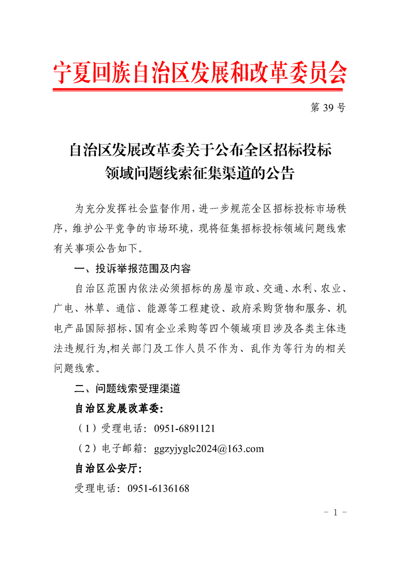 自治区发展改革委关于公布全区招标投标领域问题线索征集渠道的公告