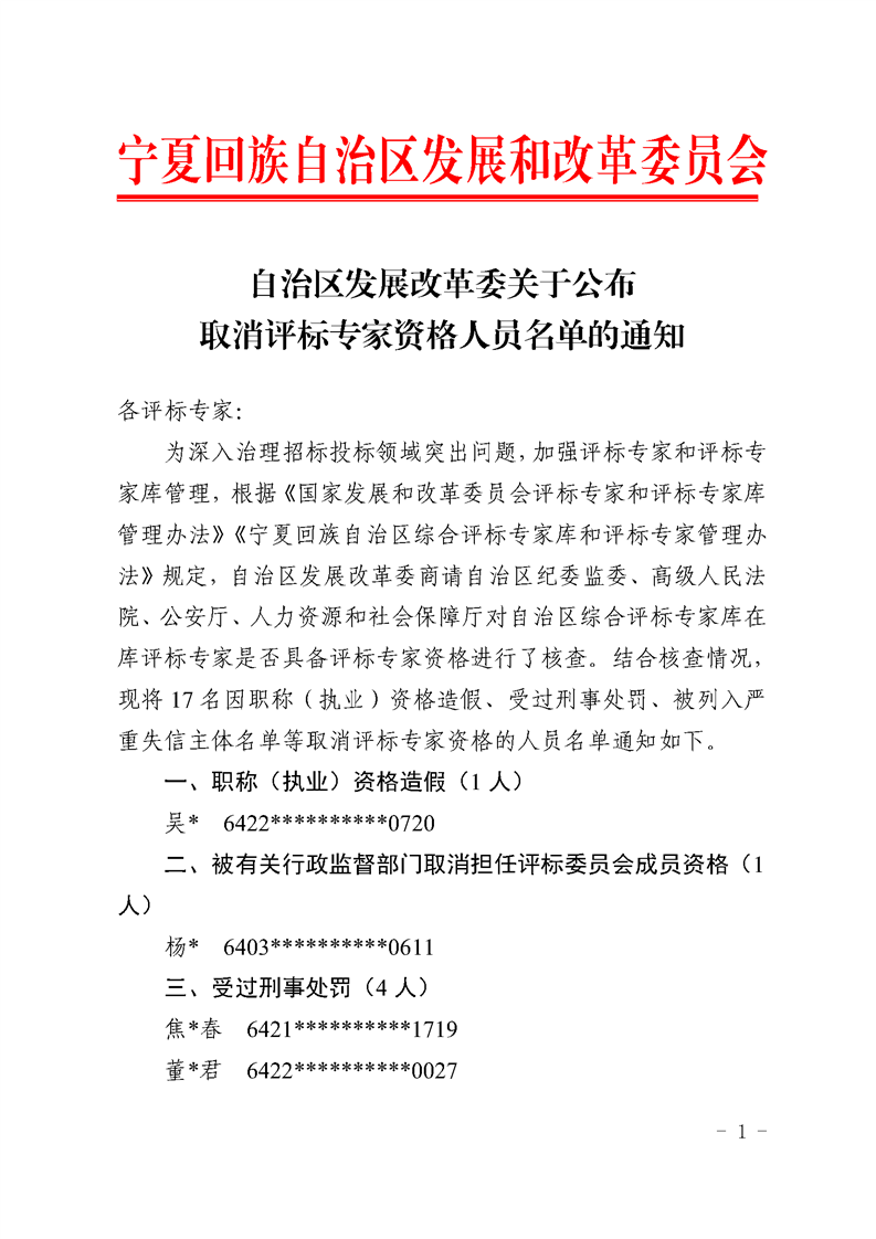 自治区发展改革委关于公布取消评标专家资格人员名单的通知